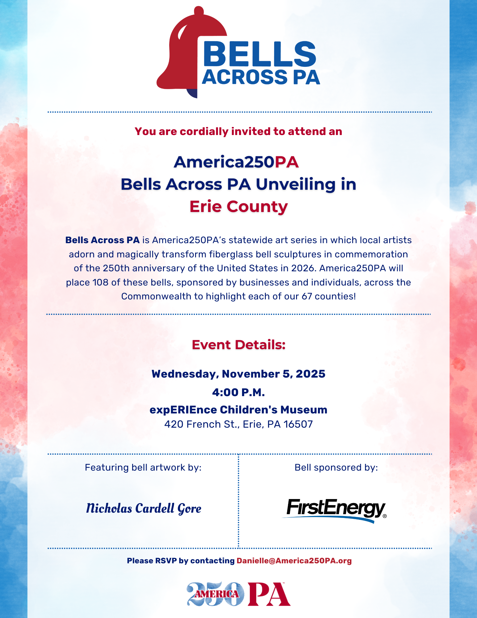 Bells Across PA – Erie Co. Unveiling Bells Across PA is part of the America250PA art series celebrating the upcoming 250th anniversary of the United States in 2026. Erie County Bell Unveiling Wednesday, November 5th expERIEnce Children’s Museum (420 French Street) 4:00 pm To RSVP, please email Danielle@America250PA.org For more information, please visit their website at https://www.america250pa.org/PPE:_Bells_Across_PA Debra Jageman2025-10-22T13:33:27+00:00October 22nd, 2025|